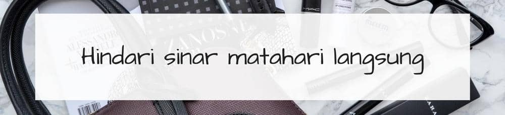 Tas berbahan kulit cukup sensitif jika berhadapan dengan sinar matahari, karena panas dari matahari bisa merusak permukaan kulit. Oleh karena itu, pastikan tasmu tidak terekspos sinar matahari terlalu lama.