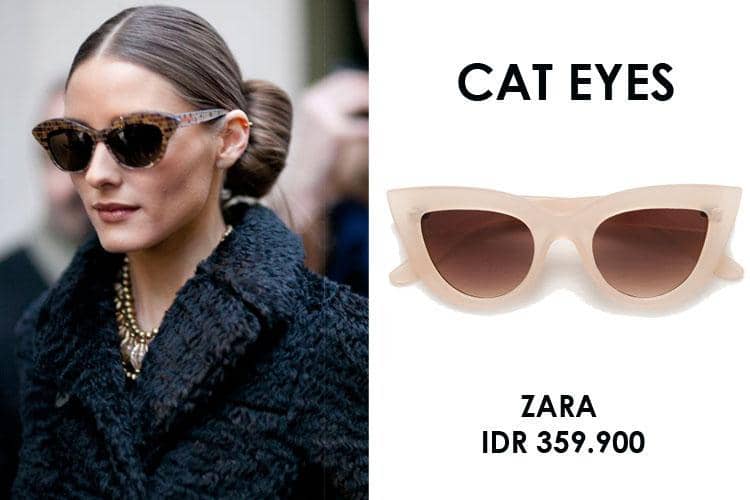 Bentuknya yang chic membuat kacamata ini jadi pilihan favorit para bintang street style dan juga selebriti Hollywood seperti Kourtney Kardashian. Kabar baiknya, kacamata cat eyes bisa digunakan oleh bentuk wajah apapun karena bingkai kacamata bagian atas yang meruncing tersebut membantu membuat garis wajah menjadi terlihat lebih lembut.