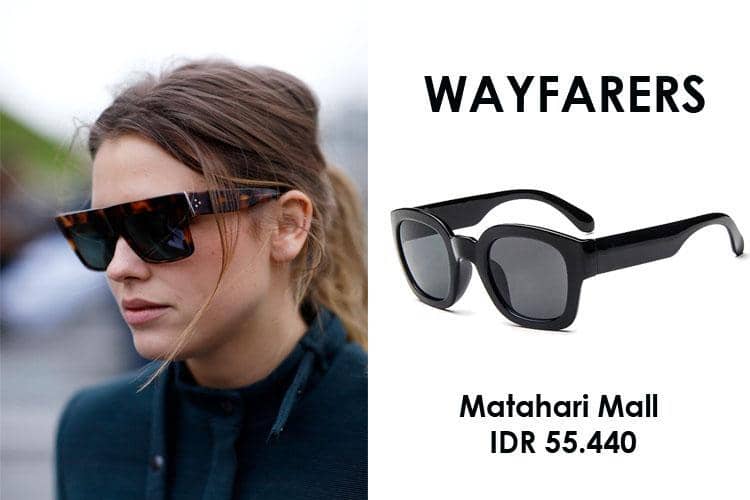 Kacamata berbentuk kotak ini juga sempat menjadi tren di kalangan fashionista. Wayfarers cocok digunakan bagi kamu yang memiliki bentuk wajah bulat atau oval. Walau terlihat seperti kacamata Pria, wayfarers bisa membuat tampilan kamu tampak edgy dan cool, Bela.