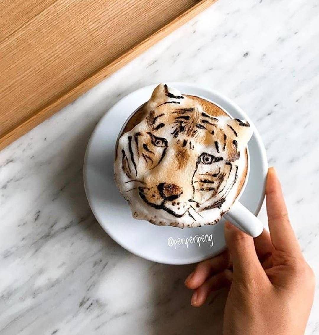 12. Latte art juga menghiasi secangkir kopi ini. Berhiaskan harimau, tampak seram sepertinya namun rasanya yang nikmat akan menemani pagimu