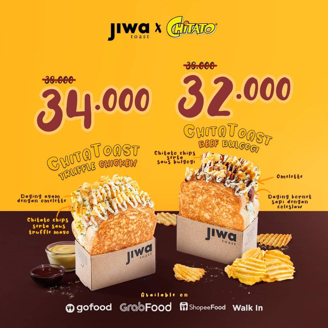 Berkolaborasi dengan brand makanan ringan ternama, Chitato, Jiwa Toast menghadirkan menu roti bakar asin dengan nama ChitaToast. Pada menu ChitaToast ini terdapat dua varian yang bisa kamu pilih, yakni ChitaToast Beef Bulgogi yang terdiri dari daging kornet sapi dengan coleslaw, omelette, Chitato chips serta saus bulgogi; dan ChitaToast Truffle Chicken yang berisi daging ayam dengan omelette, Chitato chips serta saus truffle mayo.