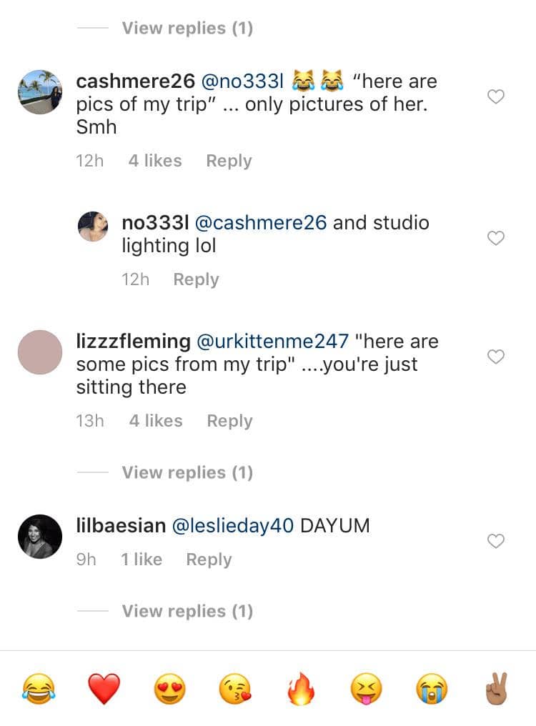 7. Begitu juga dengan dua akun lainnya. Akun @cashmere26 menuliskan komentar “Ini foto-fotoku. Tapi cuma foto dia aja. Ya ampun!” sedangkan akun @lizzzfleming menyindir dengan kalimat “Ini beberapa foto dari perjalananku,” “lo cuma berdiri aja di situ.”
