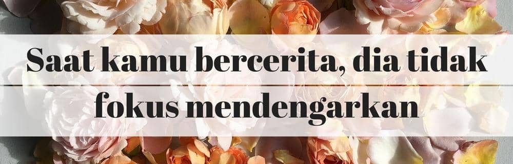 Menceritakan kegiatan sehari-hari pada pasangan dapat membuat hati menjadi lega. Berkeluh kesah tentang apa yang terjadi seharian padanya dapat meringankan beban pikiran. Namun, saat kamu menceritakan kegiatanmu seharian dan dia nggak fokus mendengarkan, bisa jadi dia nggak tertarik mendengar apalagi membantumu meringankan masalah. Dia mau mendengarkan ceritamu hanya bentuk dari ketidakenakannya karena dia kasihan padamu. Makanya, dia mau mendengarkan ceritamu.
