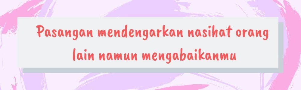 Jika pasangan nggak pernah mendengarkan saran darimu, bahkan menolak secara terang-terangan, namun ia mau mendengarkan keluarga atau temannya, nggak salah jika kamu merasa cemburu, Bela. Karena sikapnya tersebut menunjukkan kalau ia kurang menghargai pendapat atau pikiranmu. Ada sesuatu yang ia sembunyikan, kemungkinan besar ia belum memercayaimu hingga mau mendengarkanmu. Diskusikan dengannya untuk dapat mengatasi masalah ini, sekaligus mengatasi rasa insecure-mu atas sikapnya tersebut.