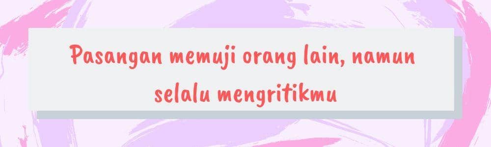 Apalagi ketika pasangan lebih sering memuji orang lain, dan mengritik dirimu, Bela. Mungkin ia hanya bersikap baik pada orang lain. Namun, sikapnya tersebut menunjukkan kalau dirinya nggak mau membuatmu merasa lebih baik, merasa baik-baik saja untuk menjatuhkan perasaanmu, dan enggan memujimu karena merasa kamu kurang pantas mendapatkannya.