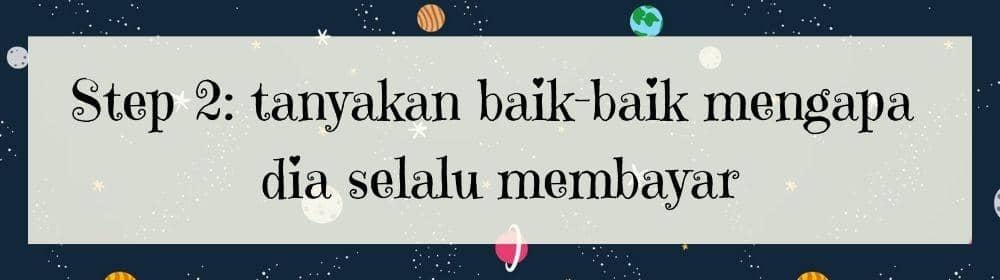 Cara terbaik untuk mengetahui mengapa ia selalu ingin membayar semua pengeluaran kalian ialah dengan bertanya langsung kepadanya. Apakah dia hanya ingin membuatmu terkesan padanya, bermaksud pamer, atau karena ingin memanjakanmu saja? Namun ingatlah, bicara soal uang adalah topik yang sensitif jadi cobalah buat percakapan yang tenang dan hati-hati agar dia nggak tersinggung ya, Bela.