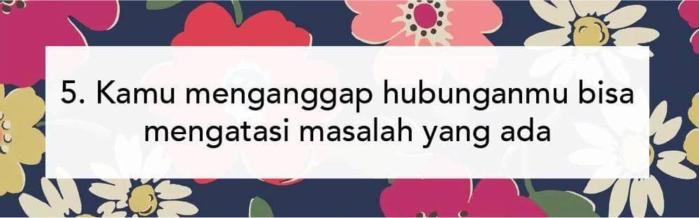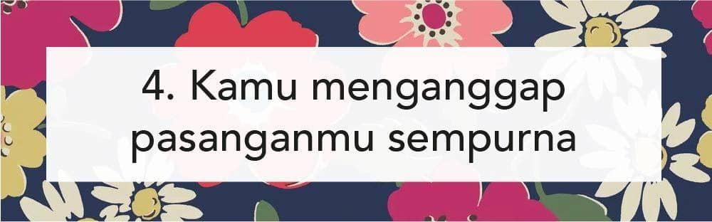 Merasa cukup dengan pasangan adalah hal yang baik. Tapi kalau menganggap pasangan kamu sempurna dan selalu memuja dia, kamu malah akan meninggikan ekspektasimu terhadap pasangan. Kalau ternyata pasangan kamu melakukan hal yang ternyata nggak sesuai ekspektasimu, kamu akan malah merasa sangat kecewa.