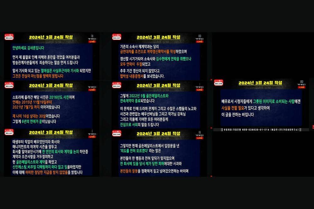 Dalam percakapan tersebut, sang bibi menyerahkan surat pernyataan yang pernah ditulis oleh Kim Sae Ron pada 24 Maret 2024, namun pada akhirnya tidak pernah diunggah ke media. Surat itu ditulis untuk menjelaskan tentang hubungannya dengan Kim Soo Hyun dan GOLD MEDALIST, tak lama setelah ia mengunggah lalu menghapus foto selfie dirinya dan Kim Soo Hyun di Instagram Story pada Maret 2024 lalu.