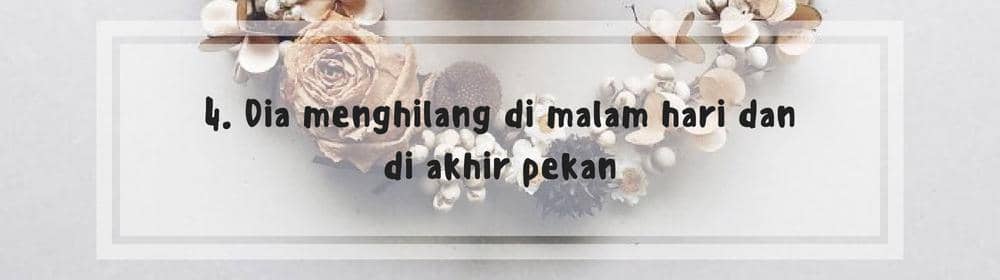 Kamu dan dia selalu chatting setiap hari dengan bahasa-bahasa yang manis. Tapi, kemudian ia menghilang di malam hari juga di tiap akhir pekan si dia nggak bisa kamu hubungi. Padahal, akhir pekan adalah waktu yang pas bagi kalian untuk bertemu dan menghabiskan waktu bersama. Hati-hati, Bela. Ini adalah salah satu tanda kalau ia memiliki kehidupan lain selain dirimu.