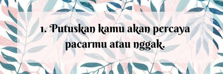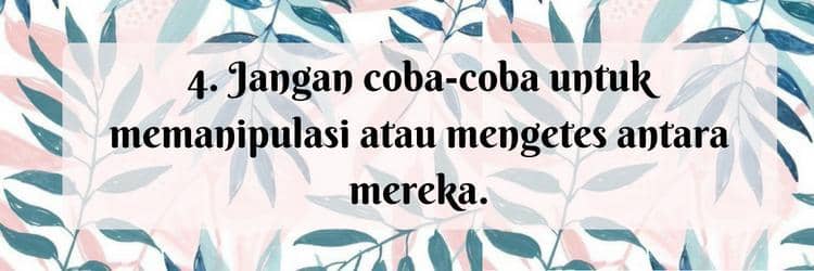 Kadang, akibat terlalu sering nonton film atau baca novel, kamu terinspirasi untuk mengetes mereka. Hindari itu, Bela. Apalagi kamu sampai memanipulasi keadaan. Hal tersebut akan membuatmu tampak makin kurang dewasa. Bukankah kamu percaya pada pacarmu?