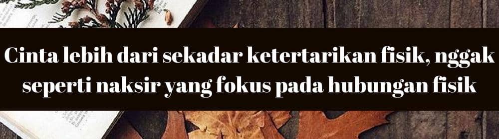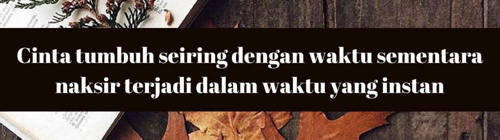 Cinta tidak datang secara tiba-tiba ke dalam benakmu. Ia tumbuh dengan pelan, berkembang secara konstan, hingga tanpa disadari ia mulai mulai tumbuh dalam hatimu. Tanpa kamu paksakan, wajahnya jadi lebih sering melintas dalam pikiranmu ketika kamu memejamkan mata. Kebutuhan kecilnya jadi hal yang berusaha kamu penuhi. Cinta membutuhkan waktu untuk tumbuh sementara cinta gila akibat naksir terjadi sesegera mungkin saat kamu melihat seseorang, lalu sirna begitu saja.