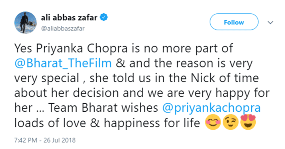 Berita membahagiakan tersebut didukung dengan tweet sutradara India, Ali Abbas Zafar, yang menyutradarai film Bharat. Dia menulis bahwa Priyanka meninggalkan proyek film tersebut karena alasan yang begitu spesial. Tweet tersebut seolah mengisyaratkan bahwa sang aktris resmi melangkah ke jenjang selanjutnya bersama Nick.