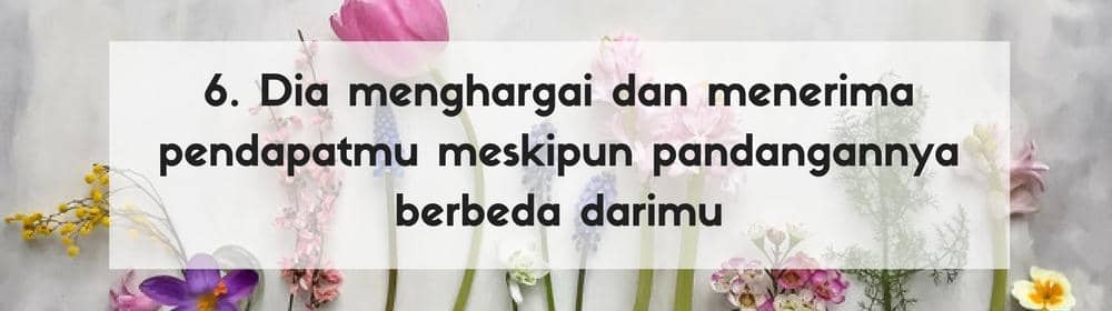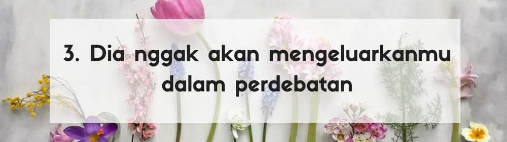 Lelaki diciptakan dengan ego yang tinggi dan keras kepala. Namun, semuanya berubah ketika dia bertemu dengan wanita yang ia cintai. Ketika berhadapan denganmu, ia akan mengerti dan menerima pendapatmu, meskipun ia sendiri nggak sepaham dengan hal itu. Dia akan berusaha mengesampingkan pendapatnya karena baginya kamu adalah hadiah terbesar yang ia miliki.