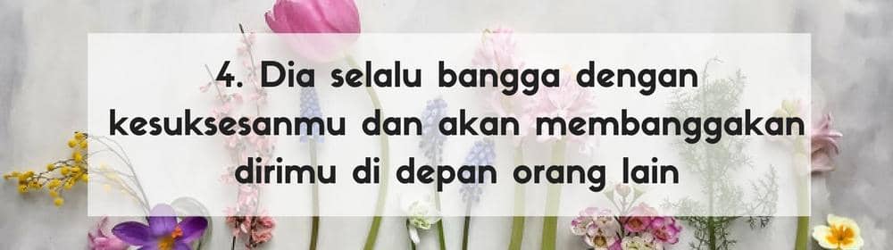 Banyak saja pria yang tidak suka jika pasangannya berhasil meraih penghargaan ketika dia gagal untuk sukses. Ia jadi merasa minder dan tak suka jika pasangannya lebih berhasil daripada dirinya. Tapi, pria yang mencintaimu justru kebalikannya. Ia akan memperlakukan pasangannya seperti bagian dari dirinya sendiri dan itulah kenapa dia selalu bahagia ketika wanitanya sukses. Nggak lupa, dia akan menceritakan kepada teman-temannya betapa ia bangga terhadap pencapaianmu.