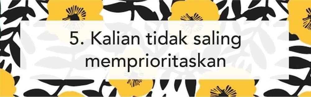 Dalam hubungan saling memprioritaskan nggak selalu harus terjadi di setiap saat. Mungkin di saat-saat tertentu kamu lebih memprioritaskan hal lain yang lebih penting. Namun kalau kamu dan pasangan bahkan nggak pernah bisa memprioritaskan satu sama lain di waktu tertentu, kamu mungkin bisa memikirkan apakah hubungan yang kamu jalani membuatmyu cukup nyaman atau nggak.