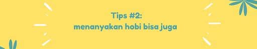Kamu bisa menanyakan dengan, “Setiap orang pasti punya hobi, boleh tahu nggak hobi kamu apa? Kali aja sama.” Mantap juga ‘kan? Coba deh langsung terapin nggak perlu malu-malu. Tapi kalau kamu dua tips diatas kamu anggap mainstream, coba deh cek tips selanjutnya.