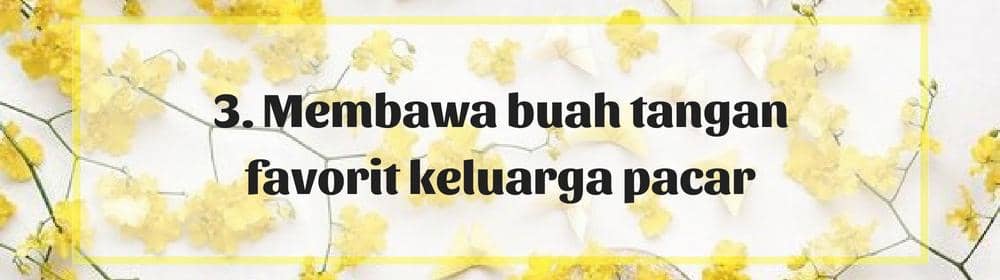 Ada yang kurang rasanya jika kita berkunjung tanpa membawa buah tangan. Bawakanlah beberapa makanan favorit orangtua pacarmu sebagai bentuk perhatian darimu. Bahkan jika ingin menarik hati mereka, kamu bisa membuat kue kering bikinan kamu sendiri untuk mereka. “Sudah perhatian, pintar masak pula,” mungkin seperti itu yang ada di benak orangtua pacarmu.