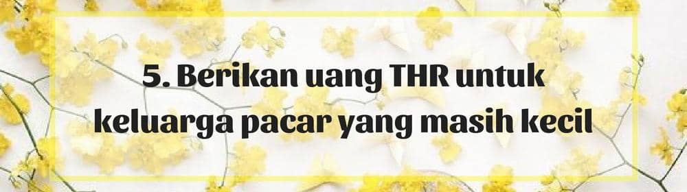 Tunjukkan perhatianmu pada sepupu atau keponakan pacarmu yang masih kecil dengan memberikan uang THR pada mereka. Masukkan uangmu dalam amplop kecil dengan motif yang lucu. Dijamin ini akan membuat mereka mengingatmu dan mengesankan bahwa kamu adalah orang yang mau berbagi dengan keluarga pacarmu.
