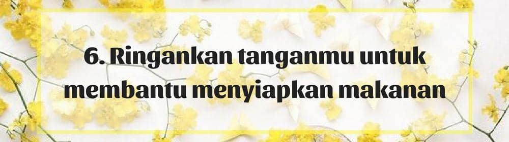 Menjelang Lebaran, biasanya para asisten rumah tangga sudah banyak yang mudik. Tentunya ini membuat orangtua pacarmu kewalahan karena nggak ada yang membantu pekerjaan rumahnya. Kamu pun bisa mengambil hati orangtua pacar dengan cara membantu melakukan hal-hal kecil, seperti menyiapkan makanan atau membereskan meja. Bantuan kecil darimu ini sangat berharga untuk sang Mama.