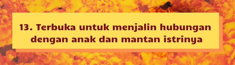 Umumnya dalam saat putus cinta, kamu dapat melepaskan masa lalu begitu mudah. Namun, laki-laki yang baru saja bercerai nggak dapat menghapus masa lalunya begitu saja. Ia memiliki mantan istri dan mungkin anak yang masih harus menerima nafkahnya. Karena itu, kamu perlu berbesar hati dan menerima kenyataan kalau dirinya memiliki masa lalu yang akan menjadi bagian dari hidupnya.