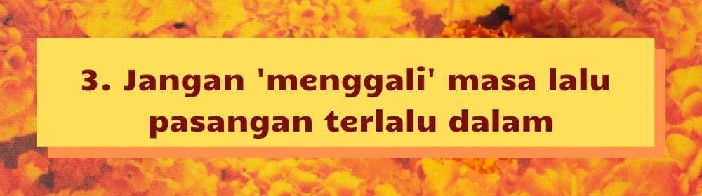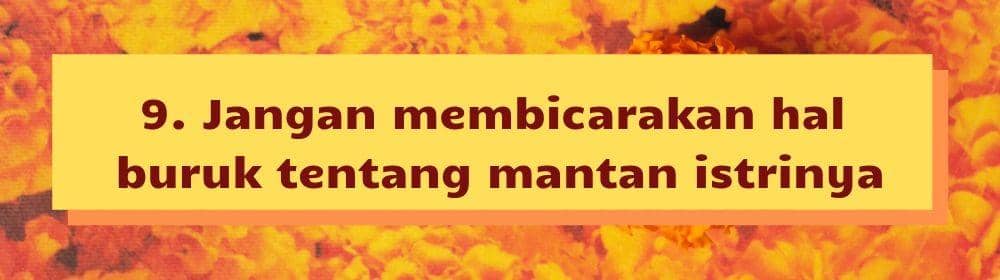 Mungkin pasangan secara nggak sadar mengatakan hal buruk tentang mantan istrinya. Namun, usahakan untuk nggak menanggapinya dengan menyetujui pendapatnya dan mengatakan hal buruk juga. Mungkin ia pernah menceritakan keburukan mantannya, namun itu bukan menjadi alasan untukmu mengungkitnya.