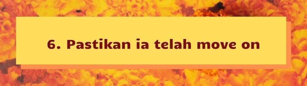 Meski mantan istri itu tetap menjadi bagian dari masa lalunya, bukan berarti itu menahan pasangan untuk move on. Sebelum menjalani hubungan yang lebih serius, pastikan jika pasangan telah move on dari mantan istrinya. Kalau ia masih sering membicarakan tentang pernikahannya, perceraiannya, mantan istrinya, dan mencoba untuk menghabiskan waktu bersamanya, ini menjadi tanda kalau ia belum sepenuhnya move on, Bela.