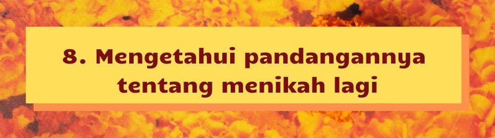 Sebagian laki-laki yang telah bercerai, enggan untuk menikah lagi. Sebagian lainnya, ada yang membuka hatinya untuk melakukan hal itu di amsa depan. Karena itu sebelum benar-benar serius dengan pasangan, cari tahu pendapat dan pandangannya tentang menikah lagi.