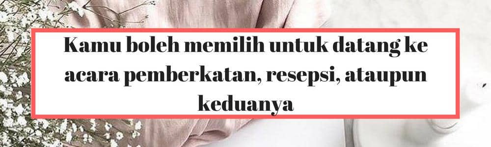 Di Indonesia, hadiah sangat penting. Namun, kamu nggakĀ perlu memutar otak untuk memikirkan sesuatu yang kreatif untuk diberikan. Dalam budaya pernikahan Indonesia, kamu cukup memberikan amplop berisi uang. Di meja penerima tamu pasti sudah ada kotak yang dihias dengan indah di mana kamu bisa menyelipkan amplop langsung ke dalam.