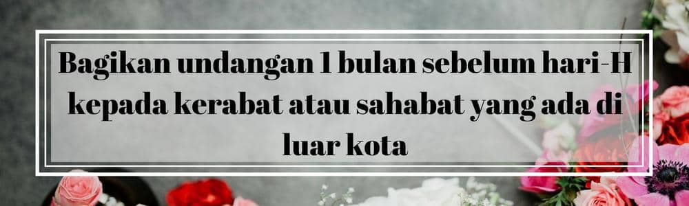 Satu bulan sebelum hari H bisa menjadi waktu yang tepat untuk menyebarkan atau membagikan undangan pernikahan, khususnya untuk para tamu yang ada di luar kota. Kamu harus memberi mereka waktu untuk mempersiapkan transportasi seperti tiket kereta atau pesawat untuk menuju ke acaramu.