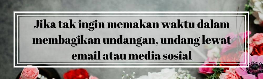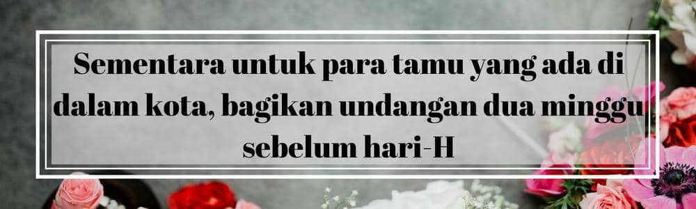 Dalam membagikan undangan pernikahan, usahakan jangan terlalu berdekatan dan jangan terlalu jauh dari hari H. Hal ini berguna untuk menghindari hal-hal yang nggak diinginkan, seperti undangan terselip hingga para tamu lupa untuk hadir dalam hari bahagiamu. Selalu pastikan nama dan alamatnya sudah benar, ya!