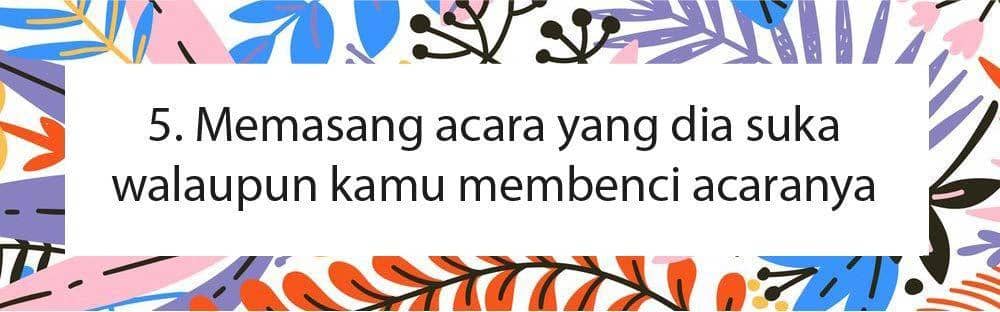 Nggak semua acaranya yang pasangan kamu tonton juga adalah acara yang kamu sukai. Mungkin bahkan kamu pernah bertengkar dengan pasangan perkara acara televisi. Namun ketika satu waktu kamu membiarkan pasangan kamu untuk menonton acara televisi yang dia suka dan kamu bergabung untuk menikmatinya, pasti akan memunculkan kebahagiaan tersendiri pada pasanganmu.