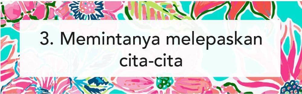 Setiap orang punya mimpi dan cita-cita, begitu pun dengan pasanganmu. Biasanya laki-laki memiliki impian-impian yang ingin digapainya. Kalau kamu nggak setuju dengan mimpi yang ingin diraih pasanganmu karena alasan tertentu dan memang masuk akal, mungkin kamu bisa membicarakannya dengan baik. Tapi kamu nggak bisa langsung untuk menyuruh pasangan kamu untuk melepaskan mimpinya. Dia bisa saja langsung tersinggung kalau kamu memintanya untuk melepaskan cita-cita yang ingin dia raih sejak lama.