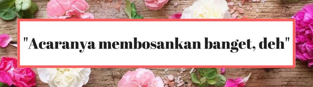 Kamu harus tahu, sesempurna apa pun sebuah pesta dipersiapkan, akan ada hal yang dirasa kurang memuaskan. Tapi percayalah, orang yang mengundang kamu pasti sudah berusaha semaksimal mungkin untuk membuat tamu-tamunya nyaman. Kalau benar acaranya membosankan, simpanlah dalam hatimu saja.