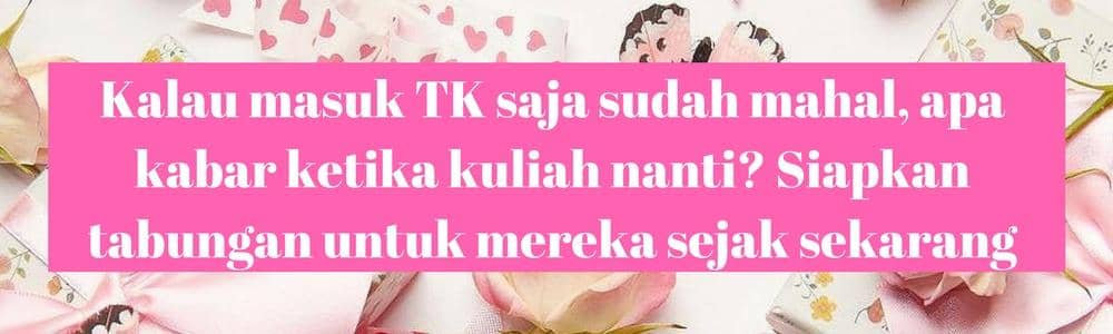Dana pendidikan tak boleh luput dari perhatian. Ingat, zaman sekarang tak lagi sama dengan jamanmu dulu. Sebelum TK bahkan ada yang namanya preschool seperti kelompok bermain atau pendidikan anak usia dini. Usia berapa tahun anak akan mulai disekolahkan dan sekolah apa yang nantinya jadi tujuan harus kamu pikirkan dengan matang. Biaya pendaftaran TK saja sekarang minimal Rp 300 ribu lho.