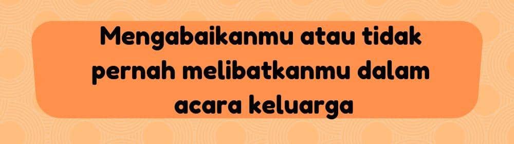 Saat ada acara keluarga, seperti ulang tahun salah satu anggota keluarga misalnya, kamu tidak pernah dilibatkan. Kalaupun diundang, kamu hanya sebagai tamu. Bukan sebagai salah satu anggota keluarga yang diberi kepercayaan untuk membantu. Kamu pun tak pernah diajak berdiskusi atau ditanya-tanya.