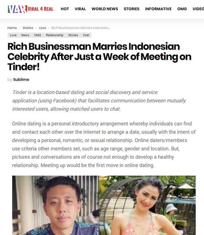 Banyak yang nggak percaya bahwa presenter Rey Utami menikah dengan pria yang baru seminggu ia kenal lewat aplikasi online dating. Jelas saja, karena sehari setelah Rey bertemu Pablo, dirinya langsung dibelikan mobil. Berita pernikahan mereka pun viral di dalam dan luar negeri, bahkan sempat masuk situs Viral 4 Real.