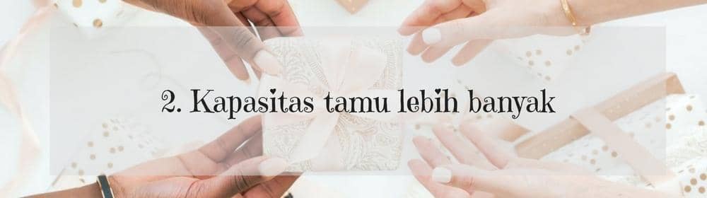 Berbeda dengan hotel yang daya tampung tamu undangannya terbatas, gedung serbaguna biasanya memiliki ukuran yang lebih luas. Dengan demikian, kamu pun bisa lebih banyak mengundang kerabat dan teman-temanmu untuk hadir dalam hari bahagiamu ini.