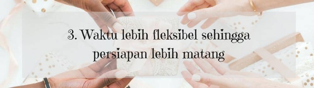 Pada umumnya, pihak penyewaan gedung serbaguna hanya menyediakan waktu 4 jam untuk satu kali acara. Pasalnya, masih ada banyak pasangan pengantin lainnya yang juga akan memakai gedung selepas acaramu selesai. Kamu pun nggak bisa berlama-lama dalam pesta pernikahanmu ini.