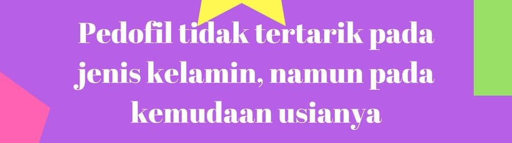 Untuk seorang pedofil, orang dewasa itu nggak menarik untuknya. Mereka hanya tertarik dengan seseorang yang masih muda dan lugu. Kemudaan itulah yang membuatnya sangat tertarik, bukan jenis kelamin. Sebagian besar pedofil menganggap bahwa bentuk tubuh serta tampan atau cantiknya wajah seseorang nggak begitu penting. Selama korbannya masih belia, mereka dengan senang hati menggarap korbannya.