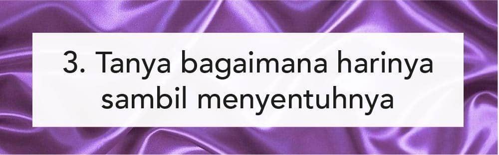 Saat pasanganmu duduk di kursi atau sofa, kamu bisa menanyai bagaimana harinya. Tunjukan rasa pedulimu dengan mendengarkan dan merasa tertarik dengan ceritanya. Selagi kamu mendengarkan, jangan lupa sentuh rambut atau kepalanya. Kamu juga bisa memainkan telinga dan lehernya. Ini adalah bagian-bagian sensitif laki-laki yang bisa membuat mereka bergairah.