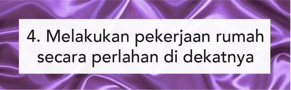 Hal lain yang bisa membuat pasangan kamu bergairah adalah ketika kamu sedang beres-beres rumah. Misalnya pasangan kamu sedang duduk di kursi atau ranjang, lakukan hal-hal kecil seperti membereskan baju, laci, atau barang di sekitar pasanganmu. Lakukan dengan perlahan agar dia bisa mengamati lekuk tubuhmu.
