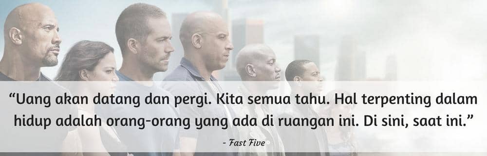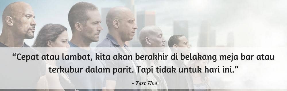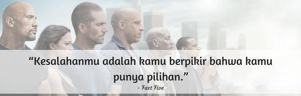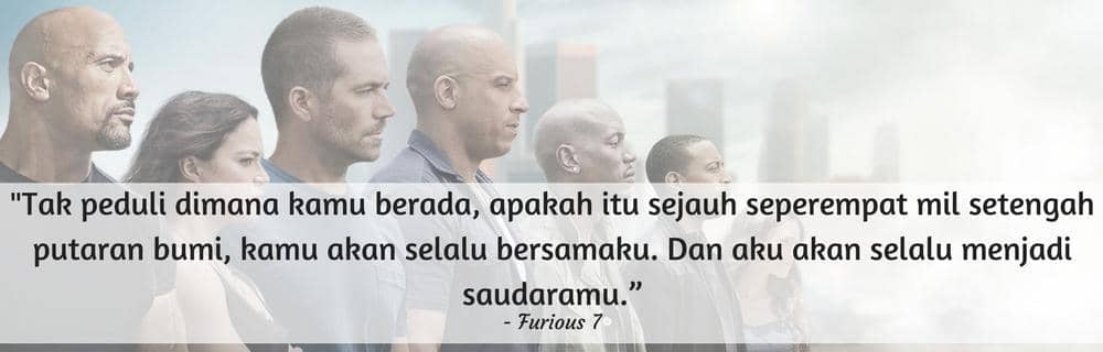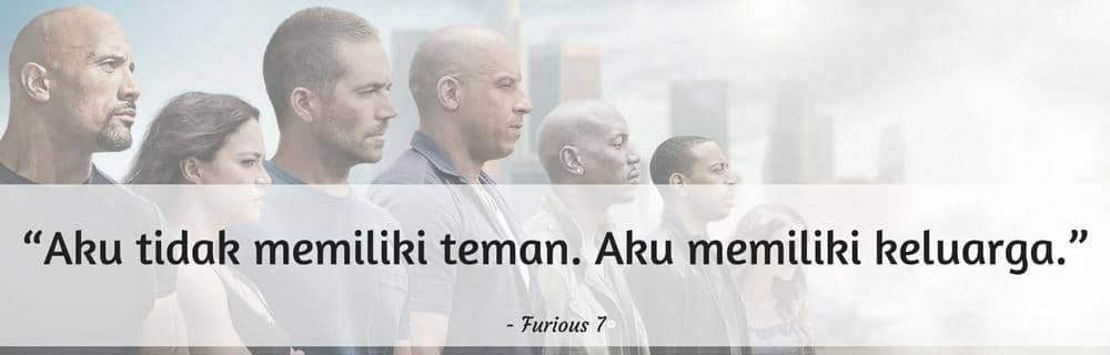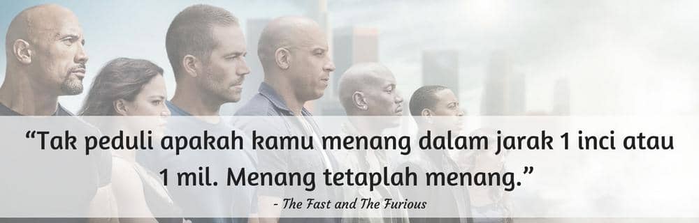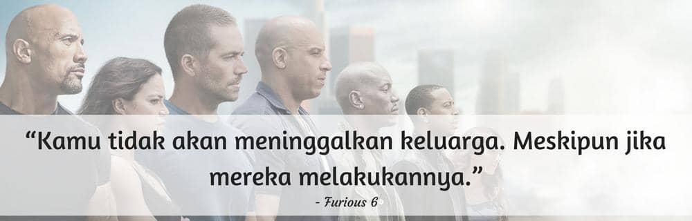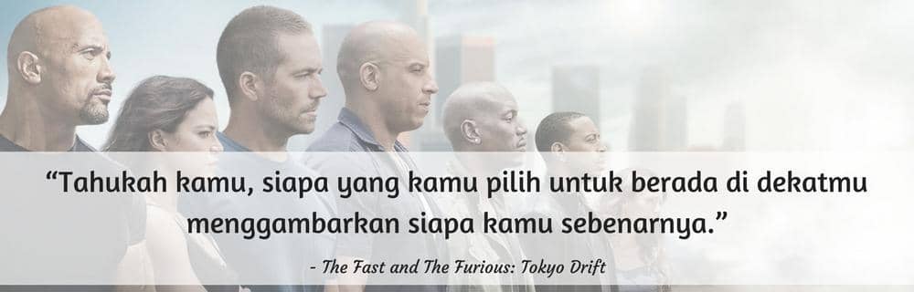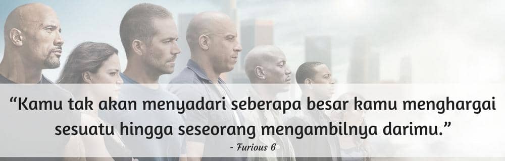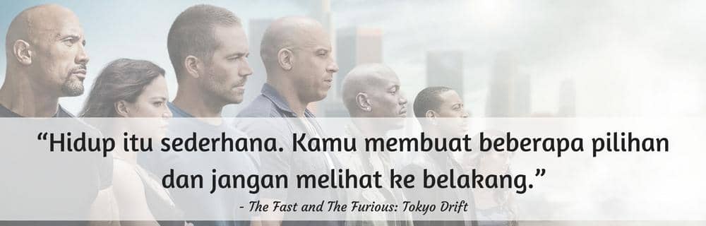 Hidup itu seperti roda yang berputar. Kadang kamu berada di atas, memandang segalanya dengan jelas dan semuanya tampak begitu sempurna. Tapi adakalanya kamu juga berada di bawah, bertahan dengan kondisi yang ada sambil berusaha sekuat tenaga untuk mendapatkan yang lebih baik. Percayalah, perputaran roda kehidupan itu tentu ada maknanya, sama seperti perputaran roda mobil dalam film Fast & Furious yang selama lebih dari 15 tahun ini menemani kita. Meski didominasi oleh adegan aksi yang menegangkan dan terkesan cowok banget, Fast & Furious telah mengajarkan kita banyak hal tentang semangat dalam kehidupan. Yuk, kita simak kutipan-kutipan inspiratifnya.