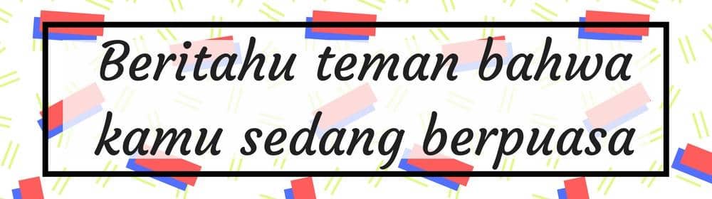Salah satu caranya yaitu mengatakan kepada mereka bahwa kamu sedang berpuasa. Jadi kamu tidak perlu sibuk menolak setiap mereka mengajakmu makan dan lebih menghargai kamu dengan cara tidak makan di depanmu.