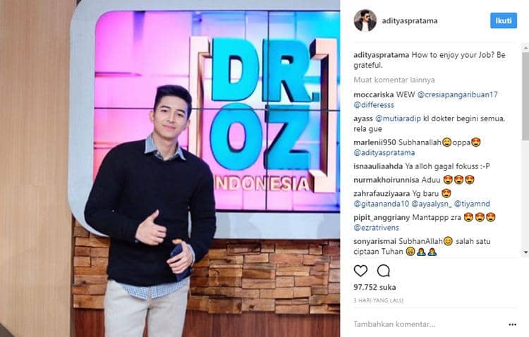 “Gimana caranya menikmati pekerjaan? Bersyukurlah”, tulisnya dalam Bahasa Inggris. Caption yang menginspirasi di samping wajahnya yang ganteng sanggup membuat hati banyak cewek meleleh. Setelah dilihat-lihat, ternyata cowok lulusan Fakultas Kedokteran Universitas YARSI ini memang sudah bekerja di dunia hiburan Tanah Air. Dia adalah menjadi pemeran utama dalam film berjudul Lima Penjuru Masjid. Namanya juga bisa kita temukan di toko buku, karena dia adalah penulis novel berjudul Aditya Lee. Nggak lengkap rasanya kalau sudah menulis, jadi host, akting tapi belum nyanyi. Tenang, Adit juga punya lagu berjudul Kekasih Bayangan kalau kamu penasaran dengan suaranya. Kalau itu semua urusan duniawi, Adit juga merupakan anak yang sholeh dan jago mengaji. Dia pernah tampil di program Islam Itu Indah dan membaca ayat-ayat Al-Quran.