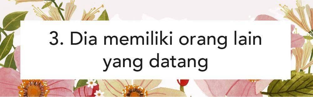 Mungkin saja, ketika kamu sedang menjalani pendekatan dengan si dia, ternyata ada orang lain yang masuk juga dalam hidupnya. Bisa jadi orang lain itu adalah orang dari masa lalunya atau dia menemukan orang baru. Akan sangat menjengkelkan dan membuat geram, namun jangan bersedih, mungkin memang akan ada orang yang lebih baik juga datang ke kehidupan kamu lho, Bela.