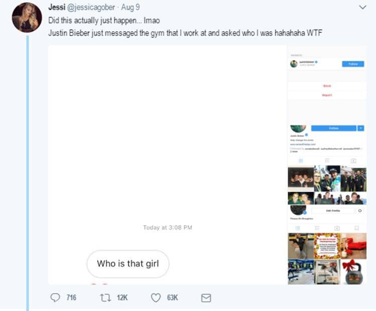 Dilansir dari Buzzfeed, cewek bernama Jessica Gober ini memang nggak menerima pesan secara langsung dari Justin. Gober yang bekerja sebagai resepsionis, nutrition & fitness coach di sebuah pusat kebugaran Fitness on Broughton muncul di sebuah video boomerang Instagram pusat kebugaran tersebut sambil mempromosikan sebuah minuman berenergi. Rupanya, video ini telah menarik perhatian Justin.