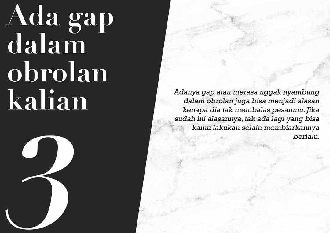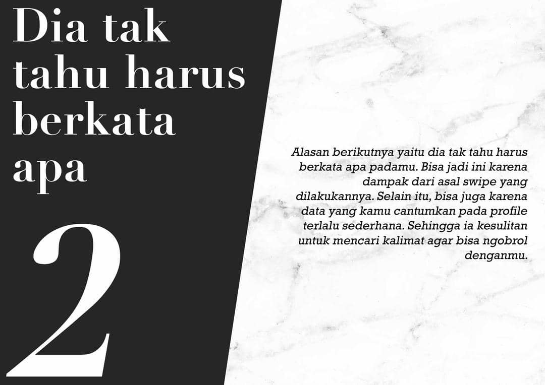 Meski sudah berhasil matched dengannya, bukan berarti perjuanganmu telah mencapai garis finish. Kamu harus melewati masa untuk chatting dan mencari kecocokan dengannya sebelum akhirnya memutuskan untuk bertemu atau berkencan. Nah, bisa saja perjuanganmu berhenti di tengah jalan karena dia tak membalas pesanmu. Jika itu terjadi, mungkin salah satu dari tiga hal ini yang ini yang jadi penyebabnya.