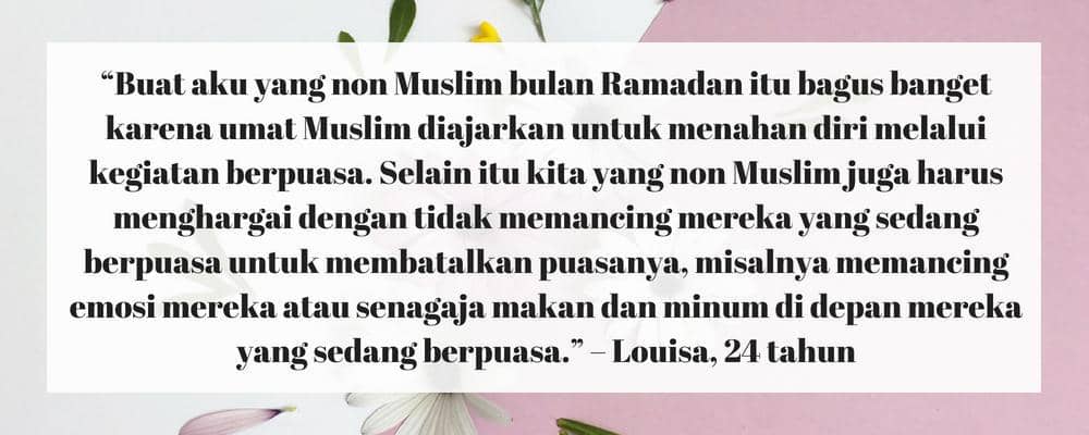 Ramadan memang bulan yang ditunggu-tunggu oleh para umat Islam di seluruh dunia. Bulan Ramadan membawa keseruan tersendiri. Khususnya ketika jam-jam akan berbuka puasa. Bulan suci yang dirayakan oleh umat Muslim ini memang membawa makna tersendiri bagi yang menjalankannya. Tapi bagaimana ya makna bulan Ramadan dimata anak-anak generasi milenial non Muslim? Berikut hasil wawancara Popbela dengan mereka.