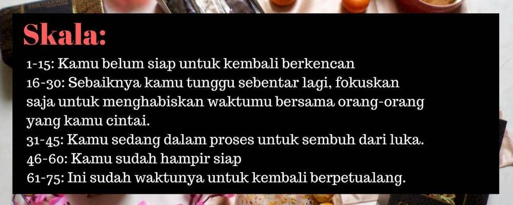 Setelah bergulat dengan rasa kecewa karena perpisahan, sebagian orang biasanya membutuhkan waktu untuk move on. Ada yang perlu waktu sebentar, ada pula yang butuh berbulan-bulan atau bahkan bertahun-tahun untuk akhirnya kembali siap menjalin hubungan baru. Nah kalau kamu sedang berada di situasi seperti ini, coba deh jawab pernyataan berikut dengan jujur. Dari pilihan jawabanmu, akan ketahuan apakah kamu sudah siap dengan hubungan baru atau belum.