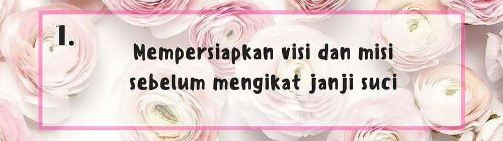 Sebelum memutuskan untuk menikah, kamu dan calon pasanganmu harus sudah mempersiapkan apa visi dan misi kehidupanmu selanjutnya. Misalnya, dalam 5 tahun ke depan, kamu ingin tetap menjadi wanita karier. Itu berarti calon pasanganmu akan mempersiapkan diri kalau ia akan mempunyai istri yang tetap bekerja meskipun sudah menikah.